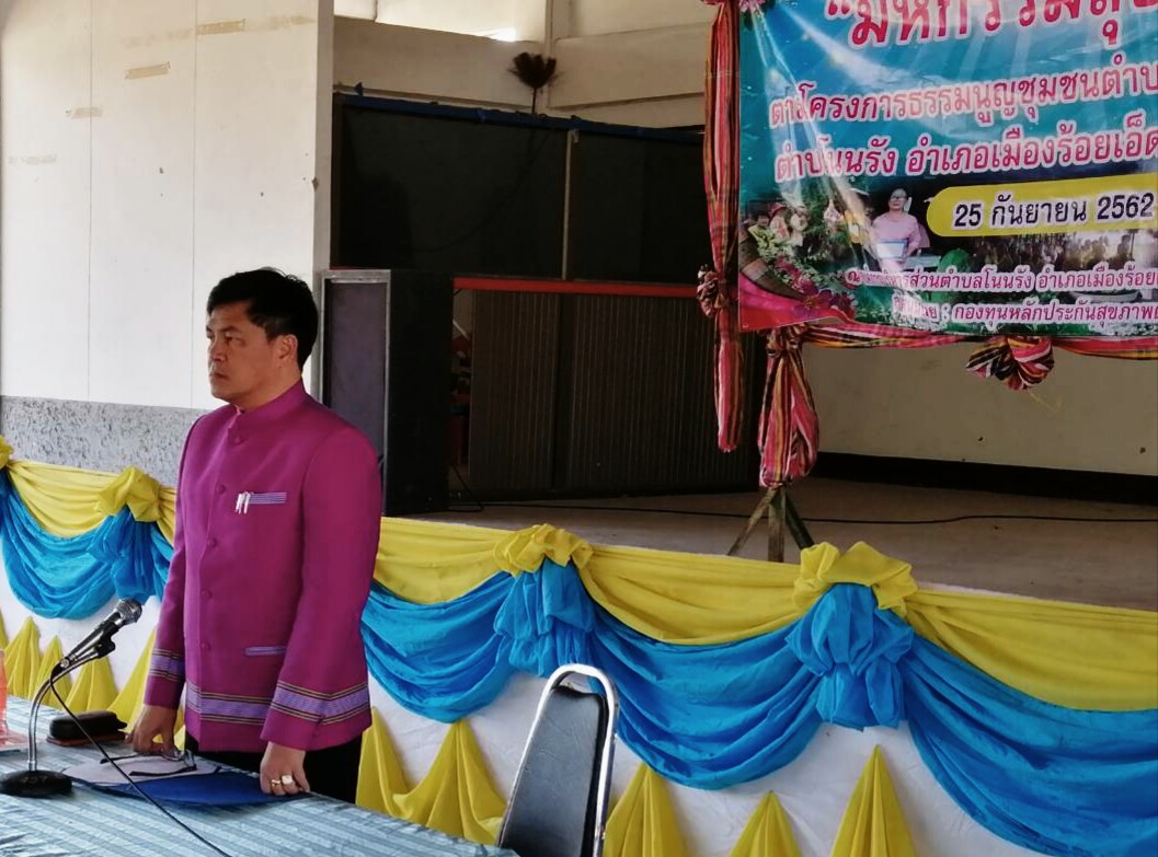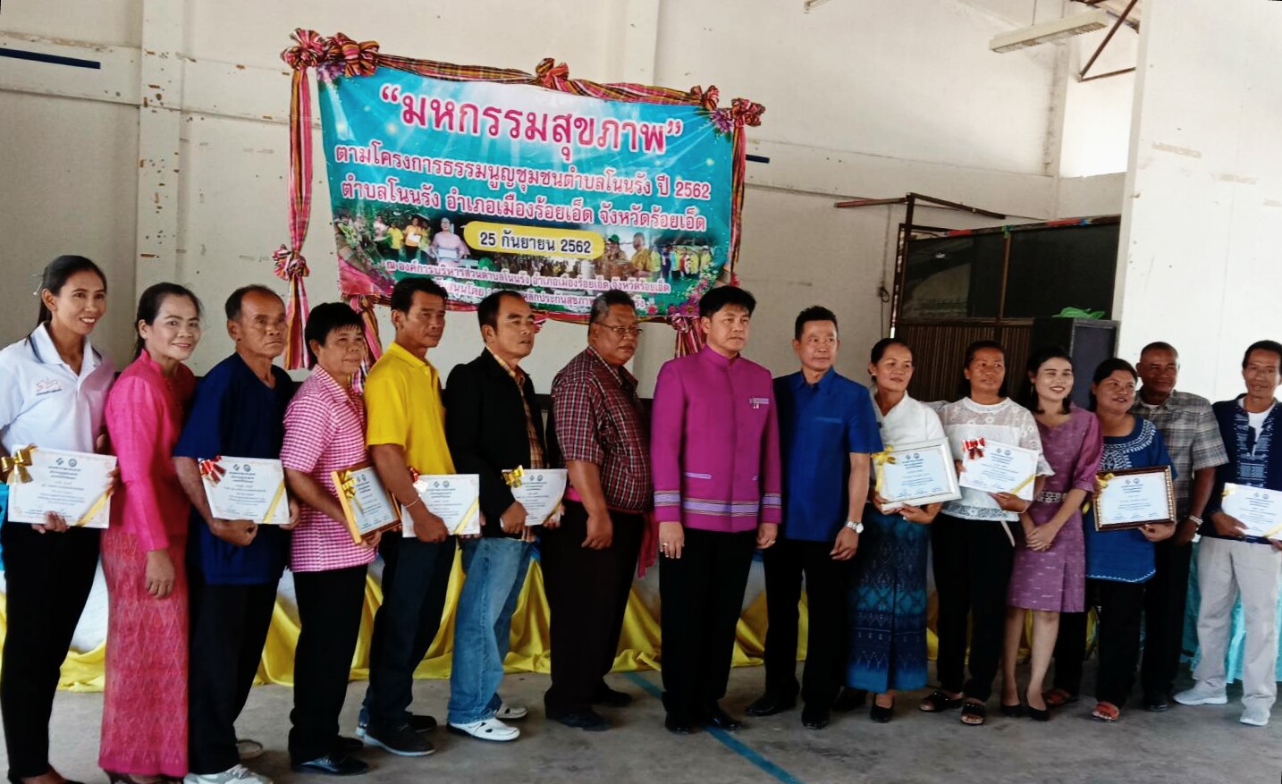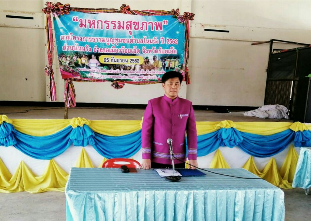 วันพุธที่( 25 กันยายน 2562) เวลา 09.30 น. นายเจนเจตน์ เจนนาวินนายอำเภอเมืองร้อยเอ็ดประธานเปิดงาน”มหกรรมสุขภาพ” โครงการธรรมนูญชุมชนตำบลโนนรัง ปี2562 มีการจัดนิทรรศการชิมอาหารเพื่อสุขภาพและพิธีมอบใบประกาศหมู่บ้านจัดการสุขภาพ ประจำปี2562 ในครั้งนี้มี****